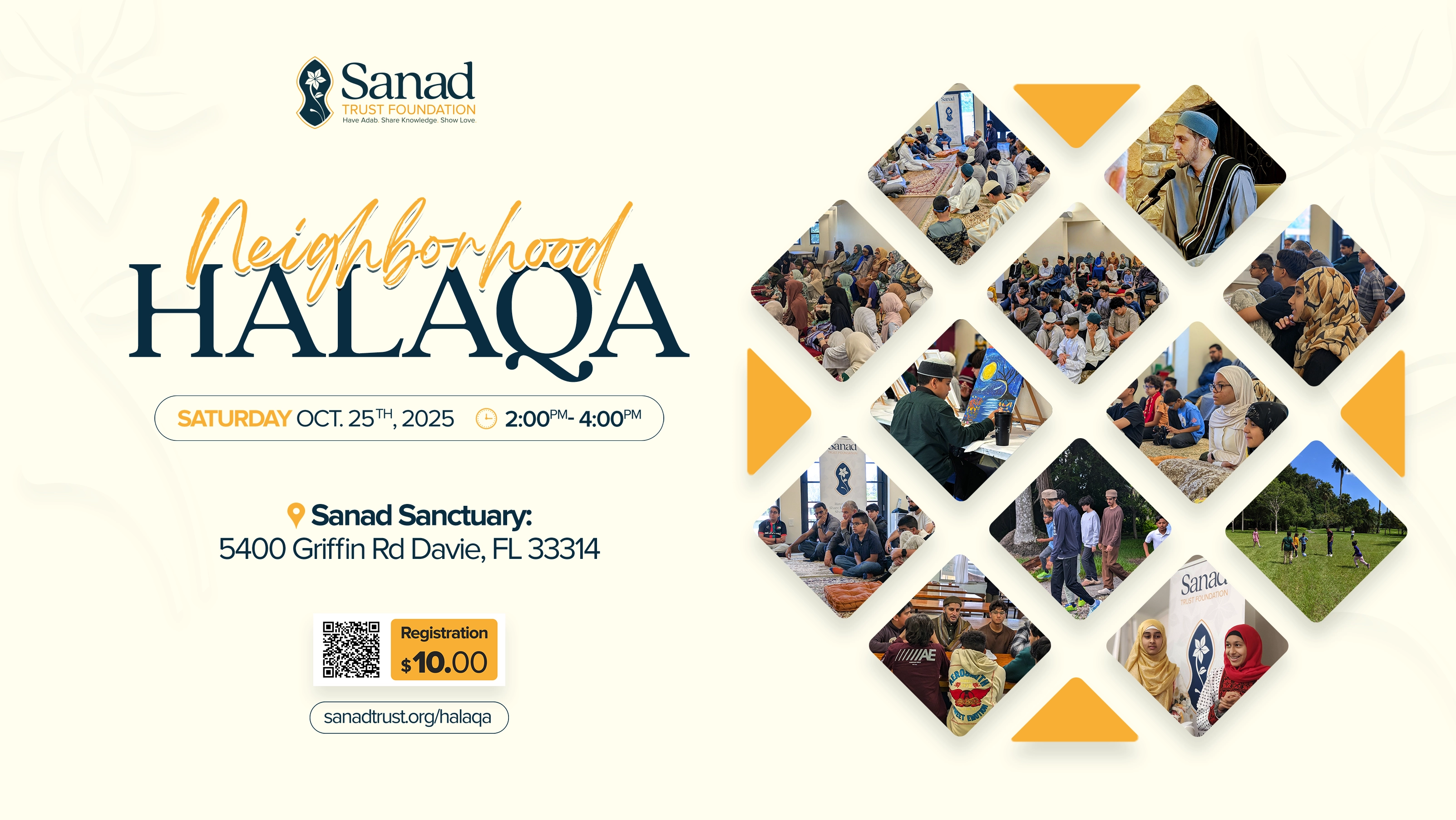 The Neighborhood Halaqa is intended to facilitate the spiritual journey of all those who attend by creating an environment of adab, shared experience, and communal support. The Halaqa concludes in remembrance with the recitation of the Ratib al Shahir of Imam al Haddad and dua.